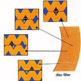 過(guo)濾(lv)時原水從外面通過(guo)過(guo)濾(lv)片(pian), 過(guo)濾(lv)片(pian)在(zai)(zai)彈簧力(li)和水力(li)的作用下被緊(jin)緊(jin)壓在(zai)(zai)一起(qi), 雜質顆粒(li)被截(jie)留在(zai)(zai)過(guo)濾(lv)片(pian)交叉點上。